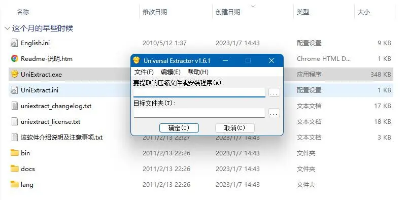 可以尝试直接将**.exe文件改后缀为.zip解压(记得备份),如果文件没加密即可获取游戏资源。 如果失败,则需要用到UniExtract**工具解压