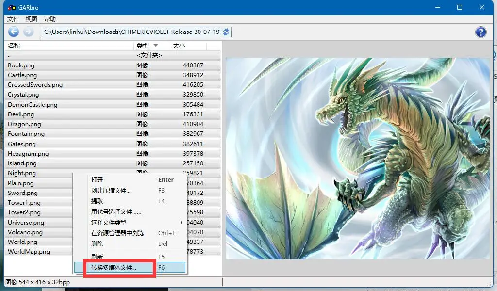 选中需要导出的图片后右键选择”转换多媒体文件“即可: